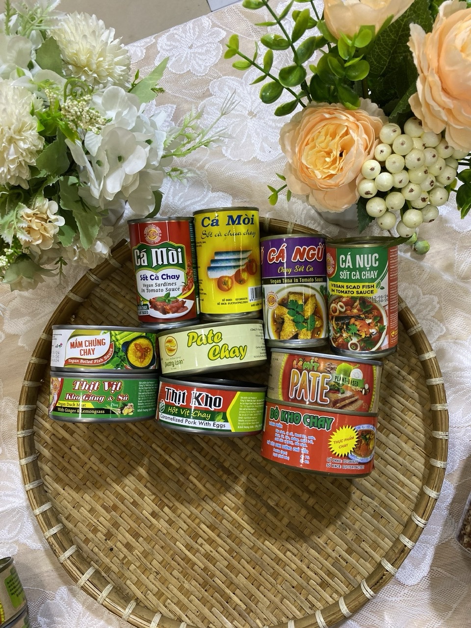 Combo 10 hàng hộp ( cá mồi 2 loại , cá nục , cá ngừ, pate hạt , pate mit , mắm chung , thịt vịt kho gừng, thịt kho hột vịt , bò kho )